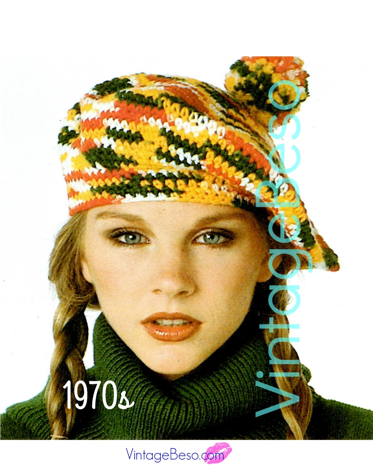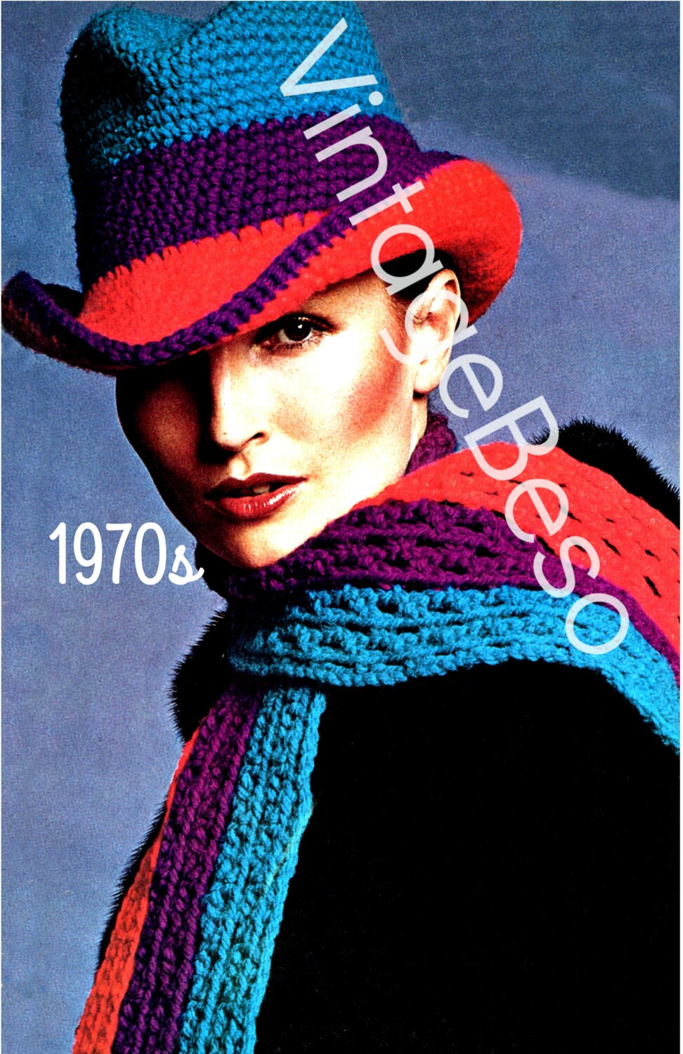 1970s USA Vintage CROCHET Pattern ❤️ Beret + Houndstooth Hat & Scarf