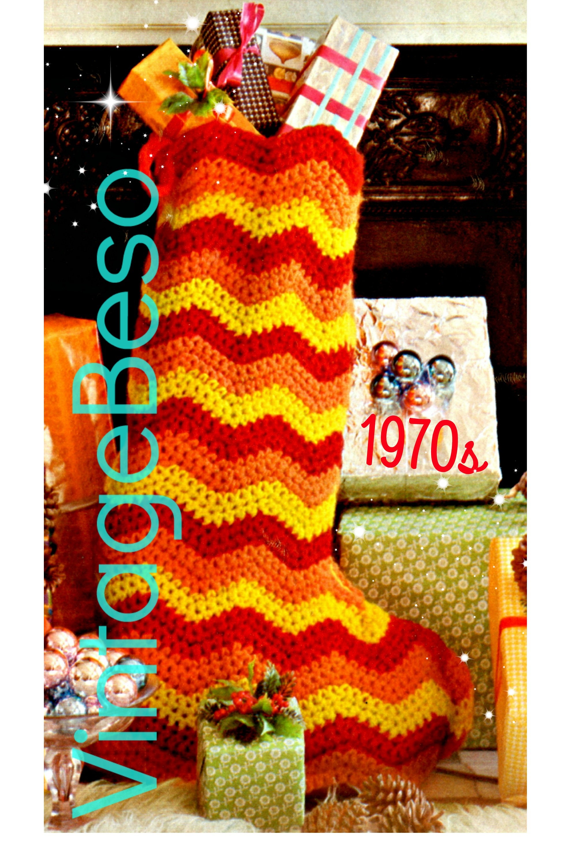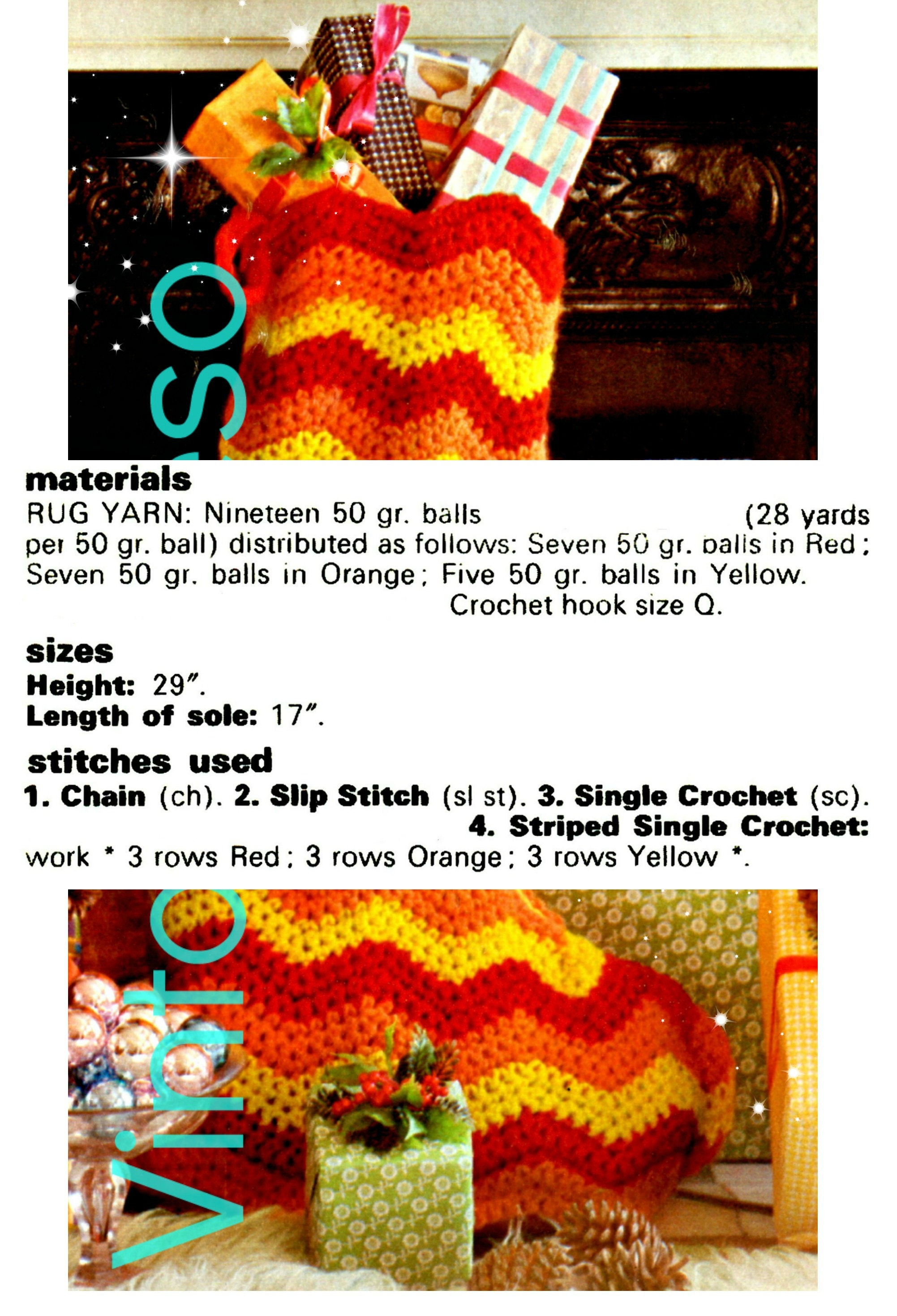 TO MAKE 1970s Ripple Zigzag Stocking - Christmas Stocking in Chevron (zigzag) Design -- enhanced from original pattern is now in PDF LARGE PRINT that is in an EASY TO READ LAYOUT makes it quick and easy to read and use --- seriously, you can pump these out fast due to only 3 stitches being utilized...Christmas will soon be here! See pics for pattern info.