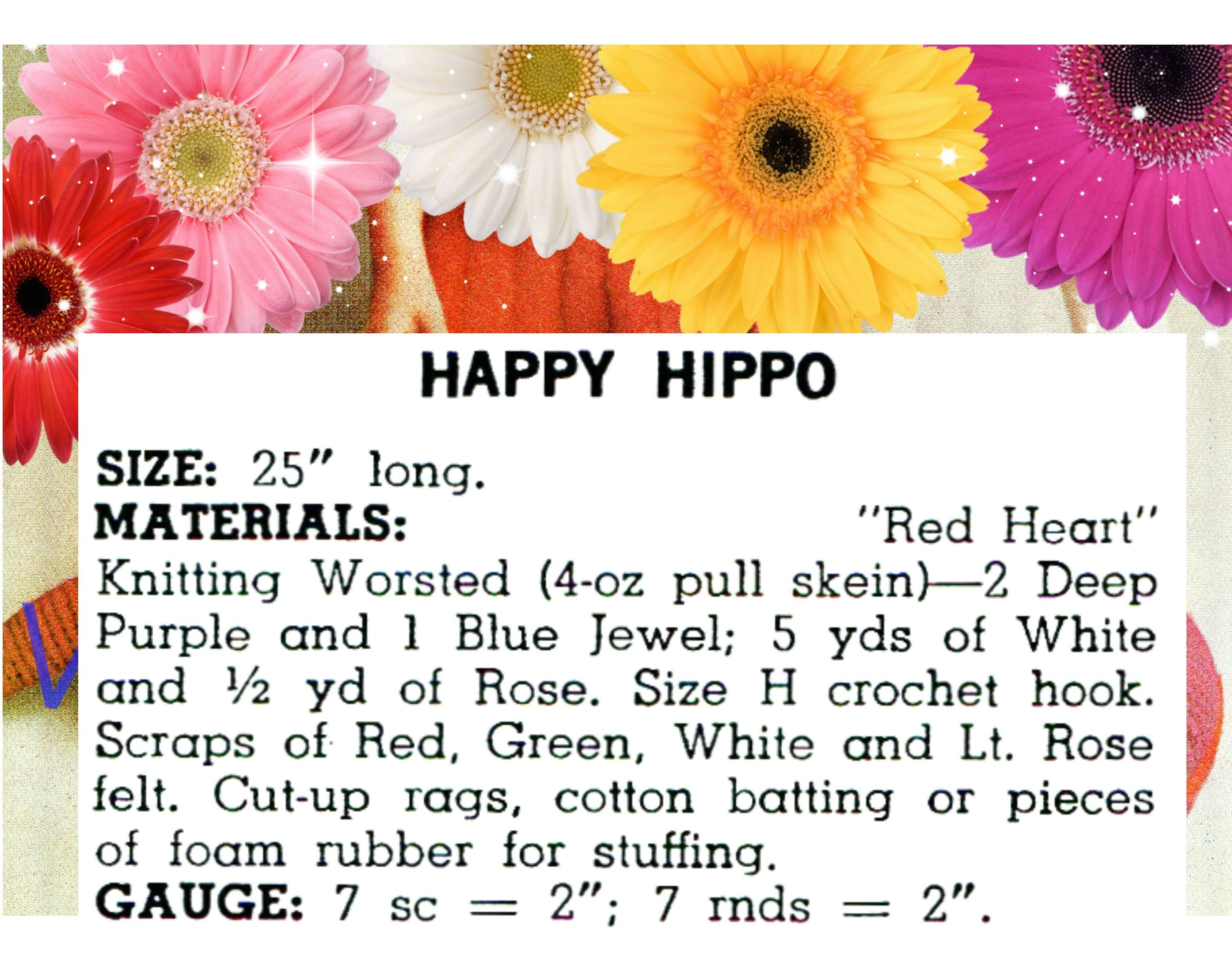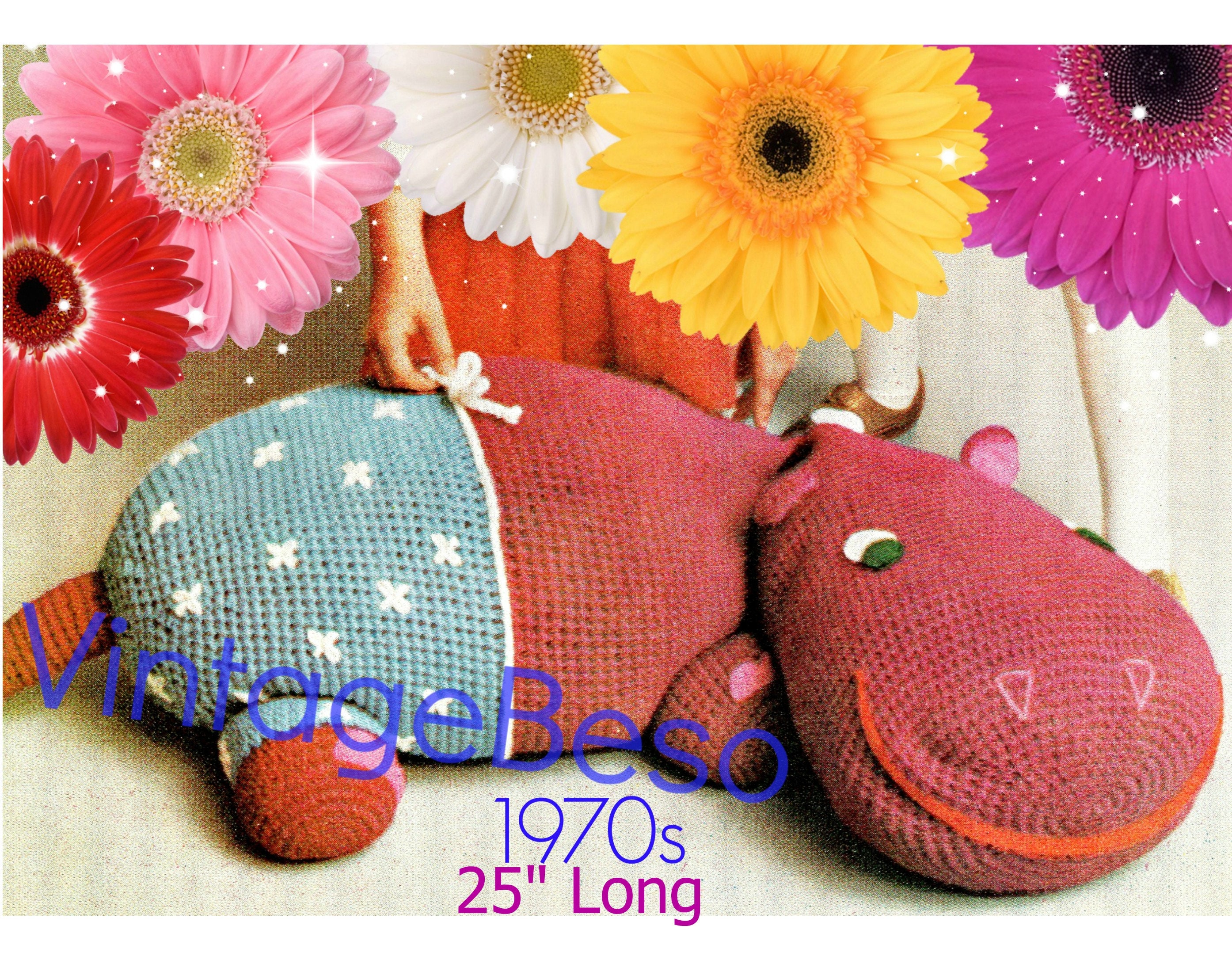 TO MAKE: Retro 1970s Happy Hippo Pillow - Retro Happy Hippo - cute and comfy - so fun to have around to watch TV, atop the bed, or in your arms giving you a big hippo hug! --- see pics for pattern info. ---> digitally restored/enhanced is now in EASY TO READ LARGE PRINT.