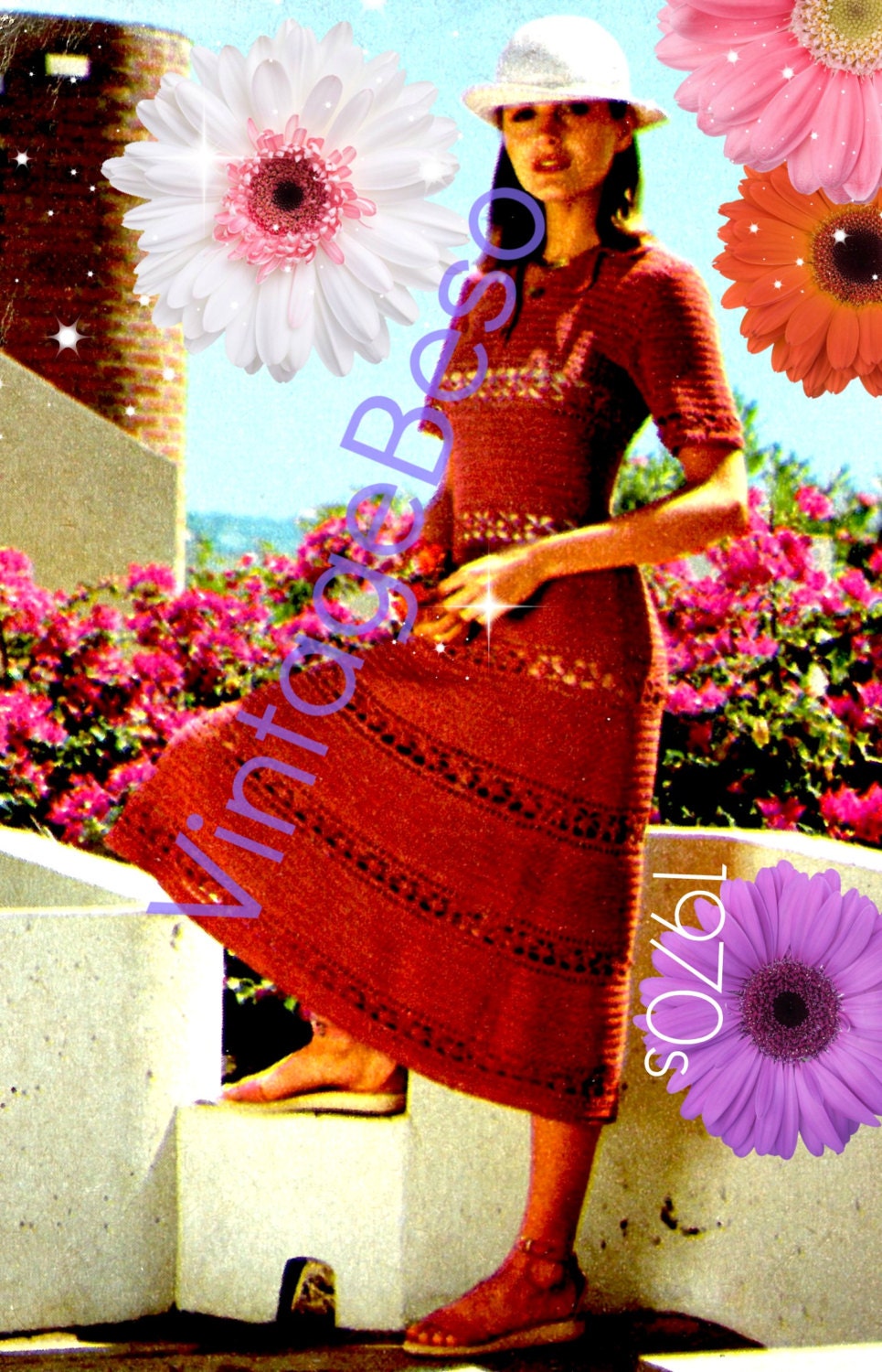 TO MAKE: Retro Summer Dress - Vintage 1970s Sexy Summer Dress - in anticipation for warm evenings and summer outings, here is a very feminine dress on which the openwork motifs create the distinctive style. This crocheted dress, banded in lacy insets done on a half double crochet background, features a flared skirt and a small opened collar. ZOOM to see stitches