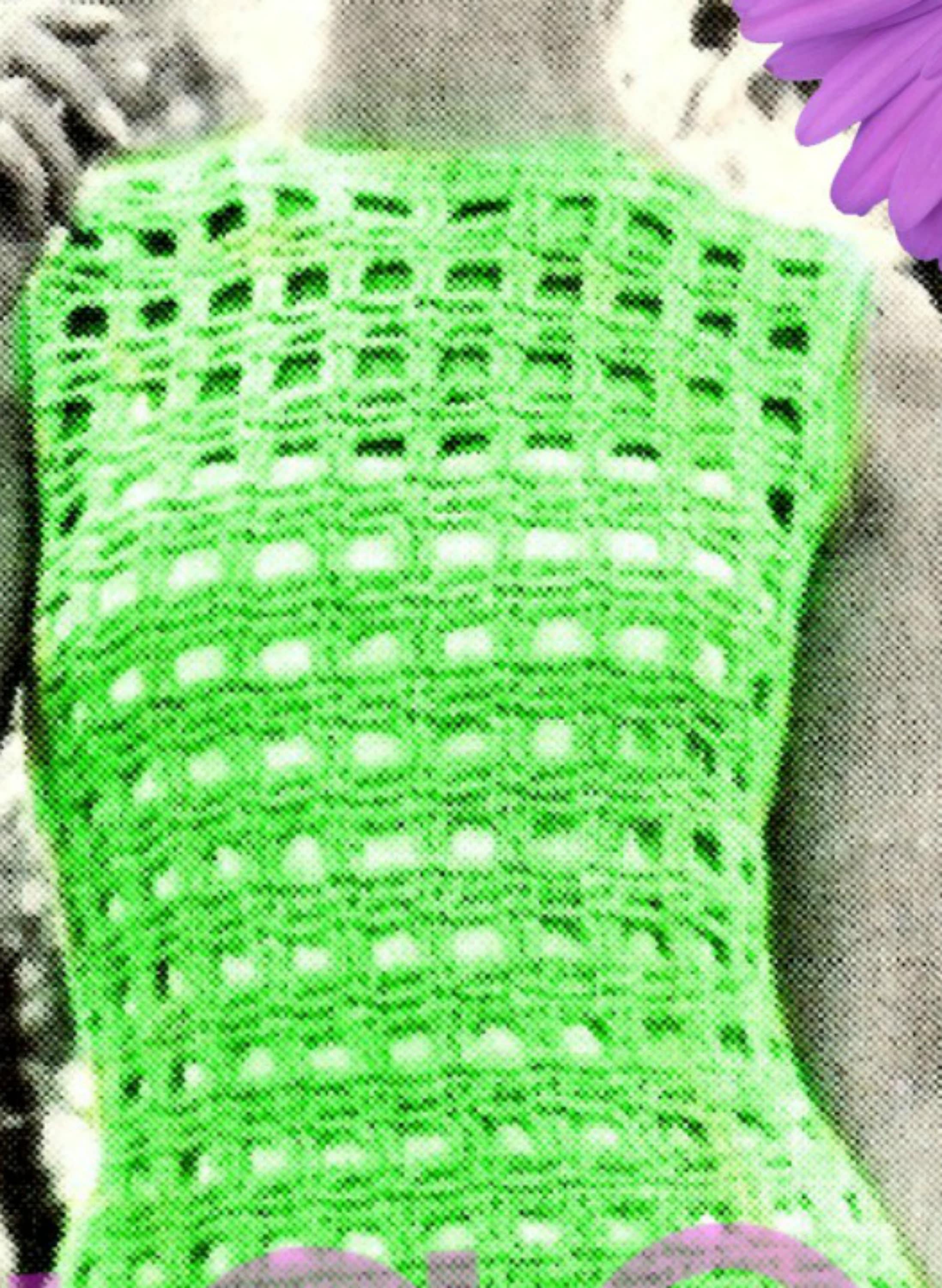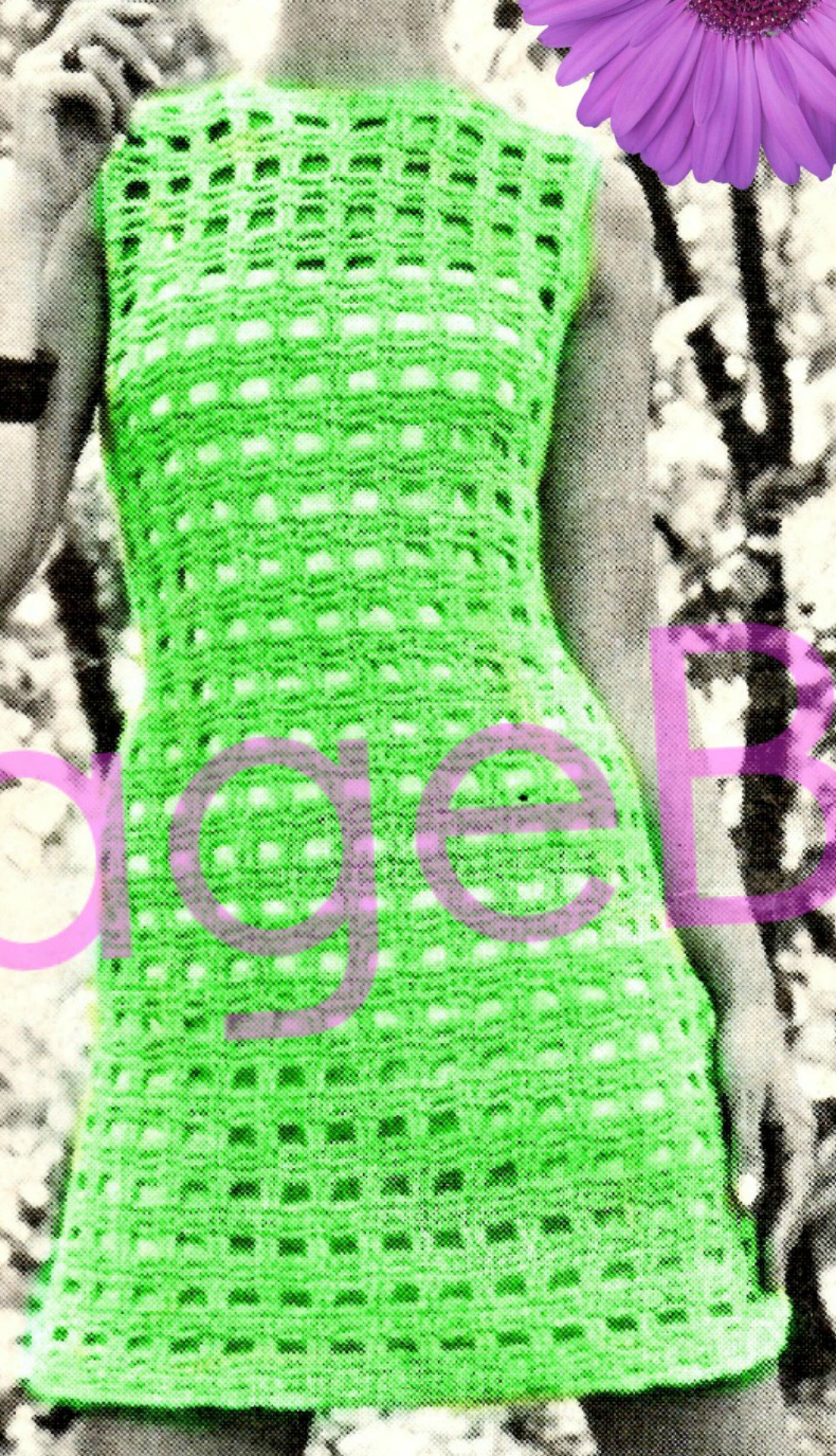 TO MAKE: Retro 1960s Dress - MOD Sleeveless Dress - this sexy lovely is called the Window Pane Charmer Dress! MATERIALS: Red Heart Knitting Worsted, 4-ply Yarn...original color that was used for the black and white photo was Apricot ♥ crochet hook size H, Gauge: 2 dc and a ch-3 sp = 1 1/8 inches; 3 rows = 1 1/8 inches. SIZES: Medium 10 to 12, Large 14 to 16