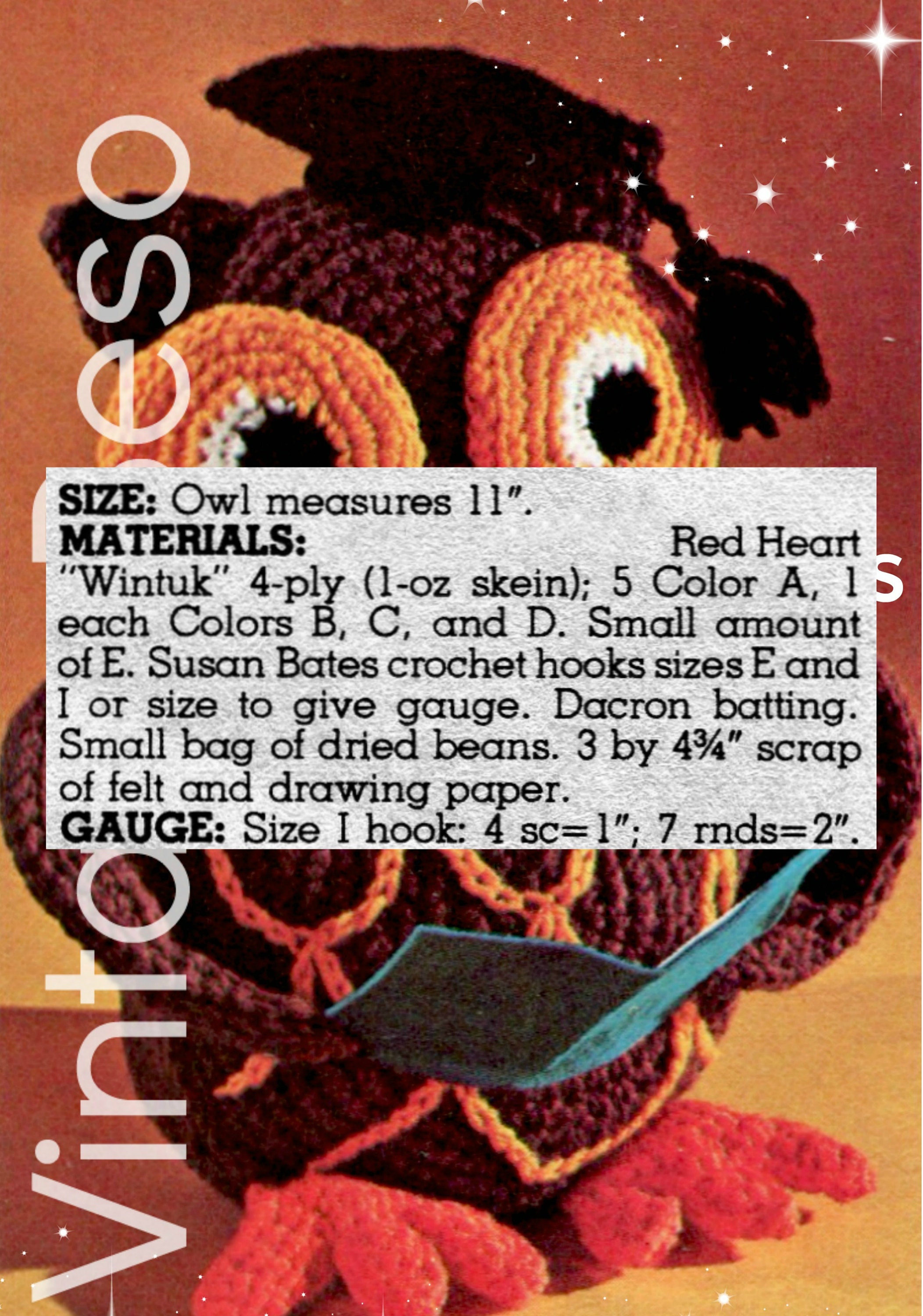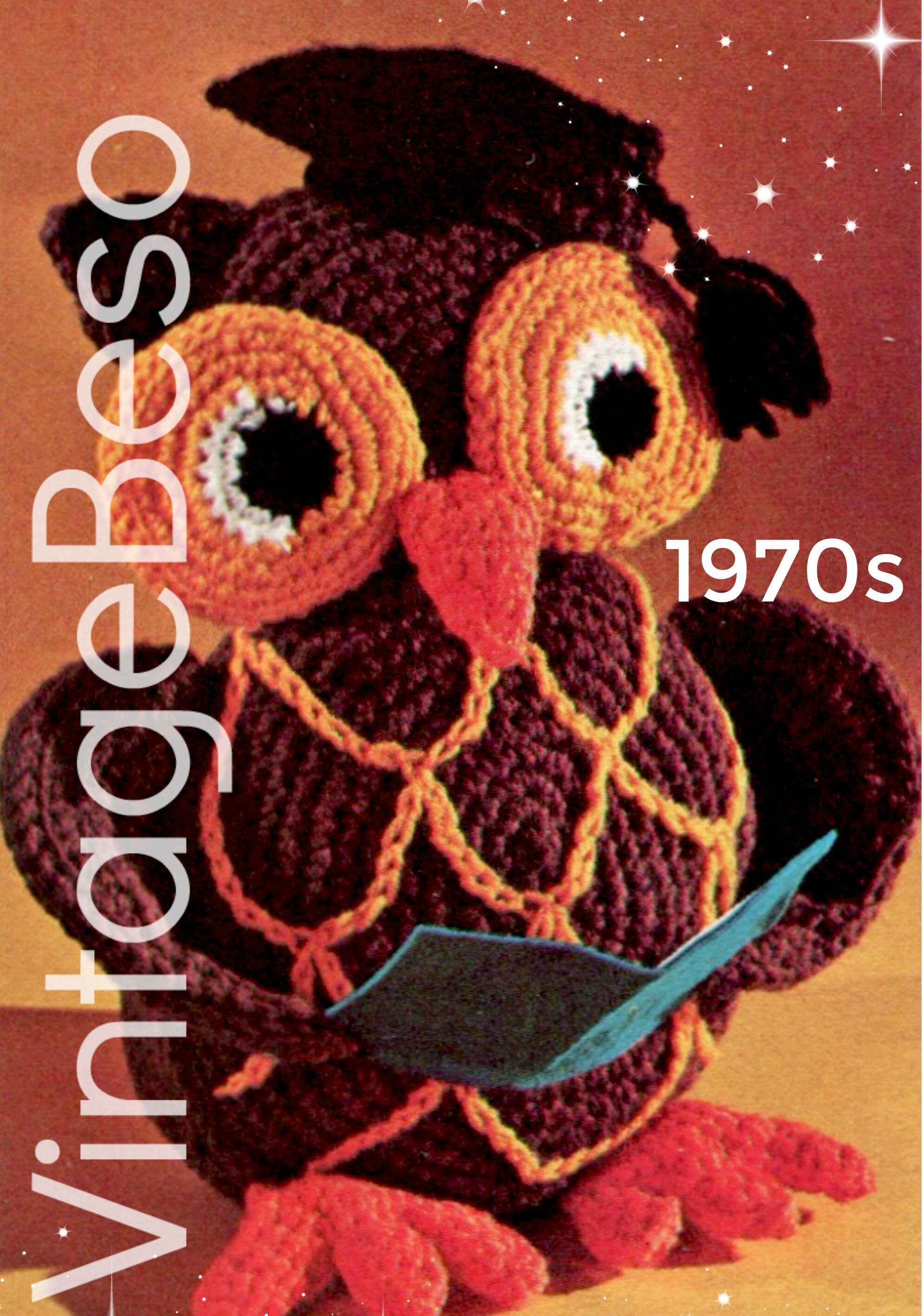 TO MAKE: Retro 1970s Professor Owl - is EASY TO CROCHET and a fun gift for GRADUATION! Memories are made on graduation day and having this little guy given to your special graduate will make the day just a little more special plus something to hold on after those fleeting moments are gone. --- see pics for pattern info. ---> digitally restored/enhanced is now in EASY TO READ LARGE PRINT.